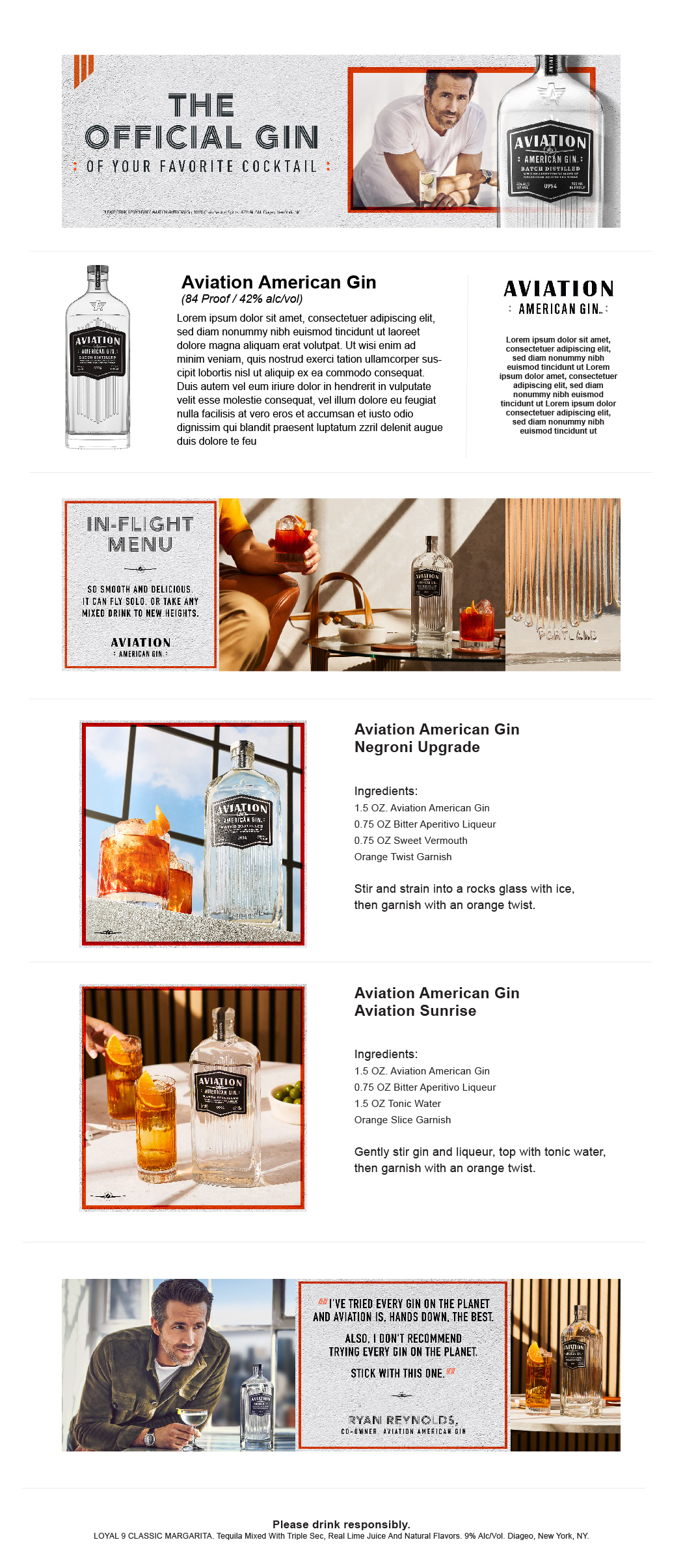 Here is a brand page I designed for Aviation American Gin, a gin company famously co-owned by actor Ryan Reynolds. That alone was kind of fun, but it was also going through a branding revamp, so much of the visuals and identity already meshed phenomenally well together, and was fun to explore, creatively.